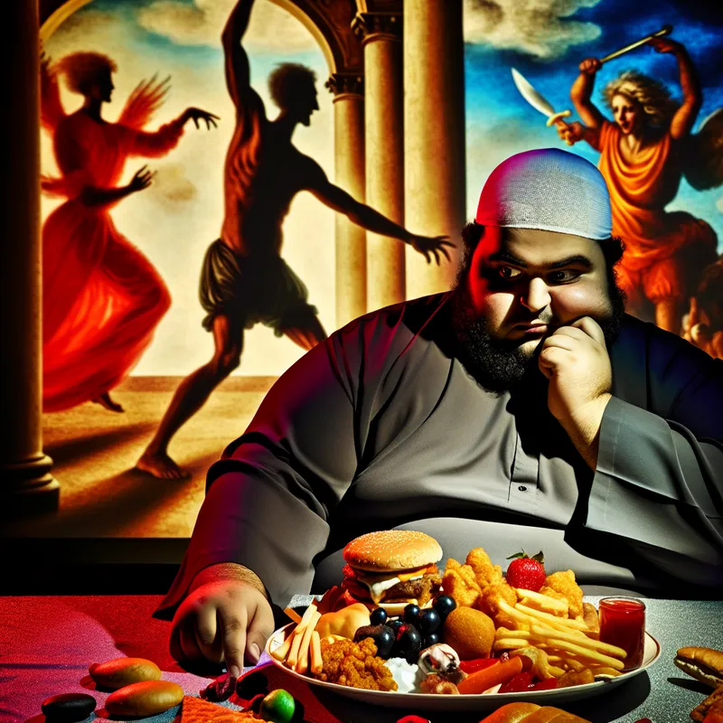 Een plomp individu kijkt naar een bord met ongezond eten, in een dramatische Barok-sfeer met schaduwen die dreigend zijn.