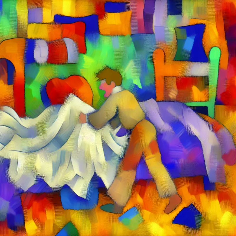 Expressieve abstracte compositie van een slaapkamer met kleurrijke beddengoed en een speelse figuur die een laken over een matras legt.