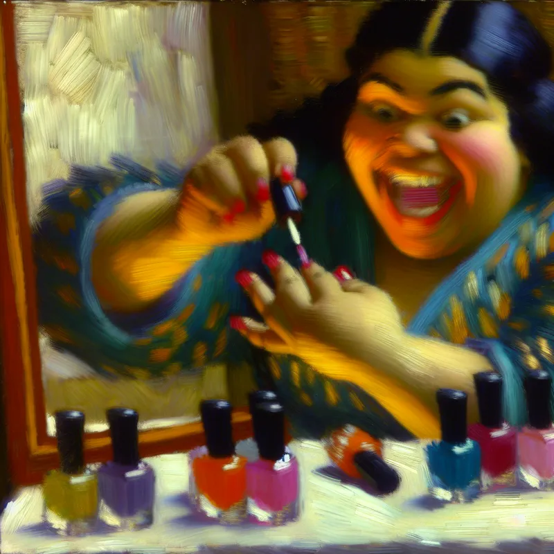 Vrouw lakt haar nagels met levendige nagellak, omringd door kleurige flesjes en een spiegel die haar blije uitdrukking weergeeft.