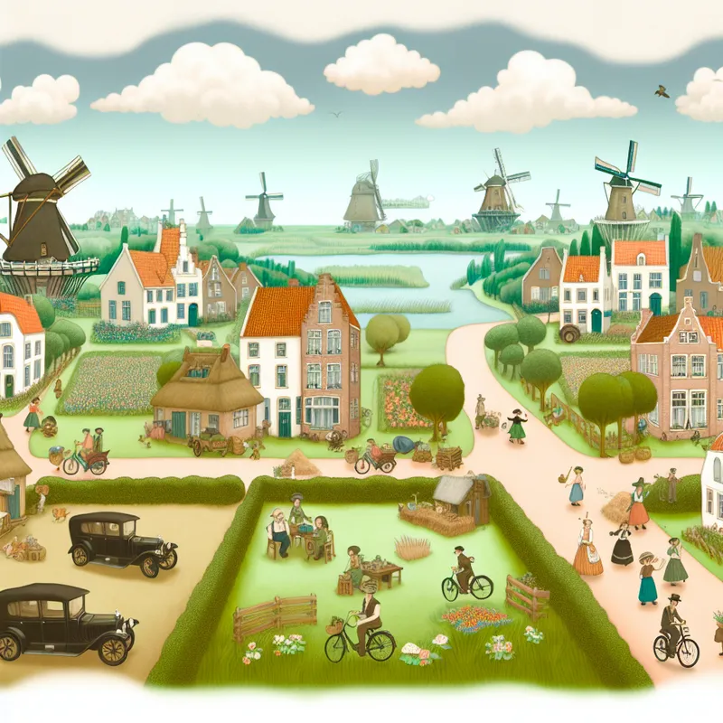 Illustratie van een klein Europees land met charmante huizen, molens en groene velden, waarin dorpsbewoners dagelijkse activiteiten uitvoeren.