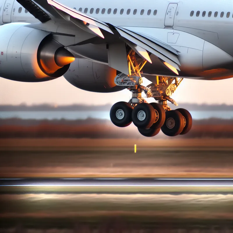 Dichtbij opname van het landingsgestel van een vliegtuig dat soepel landt op een startbaan, met focus op de gedetailleerde wielen en steunen.