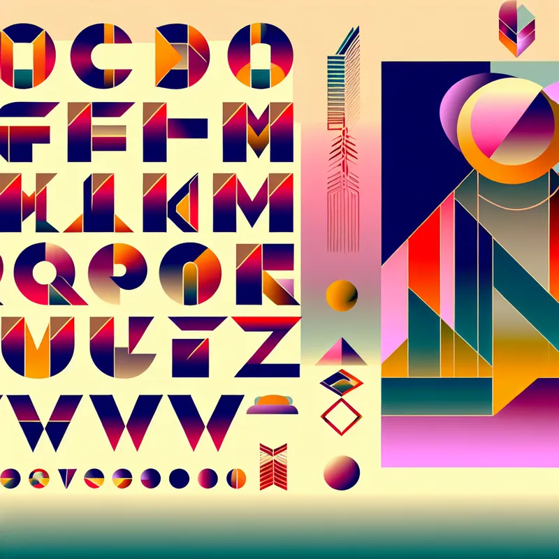 Illustratie van de 26 letters van het Nederlandse alfabet in een retro-futuristische stijl met geometrische ontwerpen en heldere kleuren.