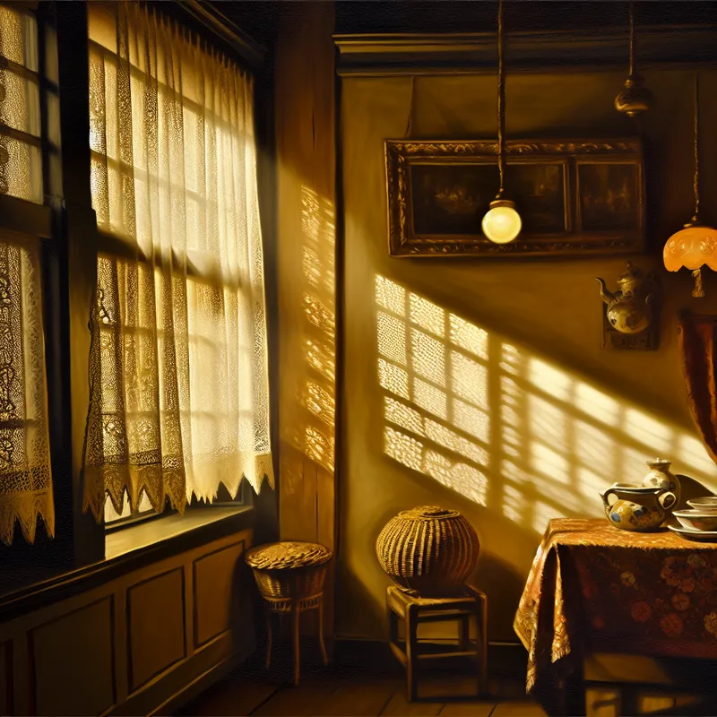 Het licht van de zon schijnt door de gordijnen.
