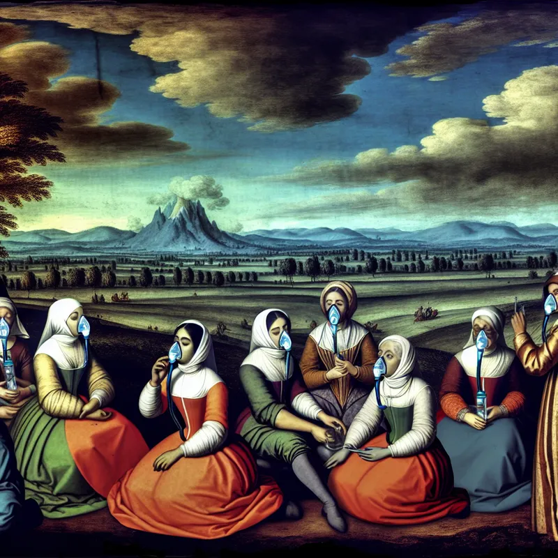 Dramatisch landschap met een open veld en een indrukwekkende lucht vol donkere wolken, met patiënten met ademhalingsproblemen en zorgverleners.
