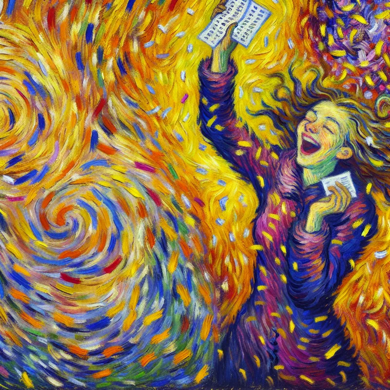Vrouw die vreugdevol een winnend lot vasthoudt, omringd door kleurrijke abstracte patronen van feestelijkheid.