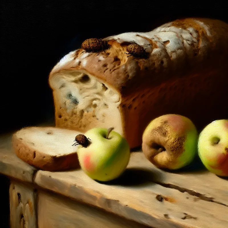 Stilleven met een beschimmeld brood en rotte appels op een rustieke houten tafel, met kleine insecten op het brood.