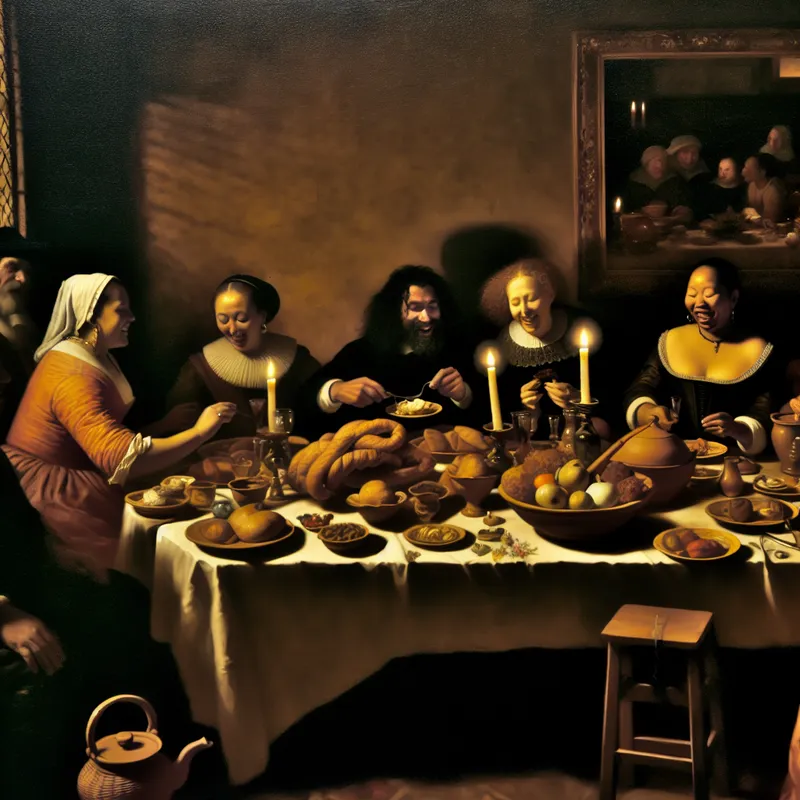 Een feestelijk gedekte tafel met een verscheidenheid aan heerlijke gerechten en lachende gasten in een sfeervolle setting.