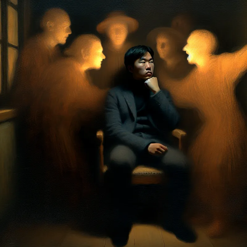 Man in schaduwrijke kamer met schijnbaar gezelschap