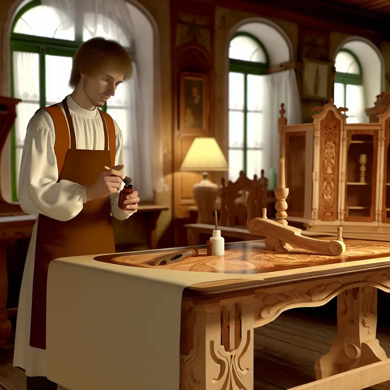 Vakkundige ambachtsman in retrofuturistische stijl werkt aan houten eettafel