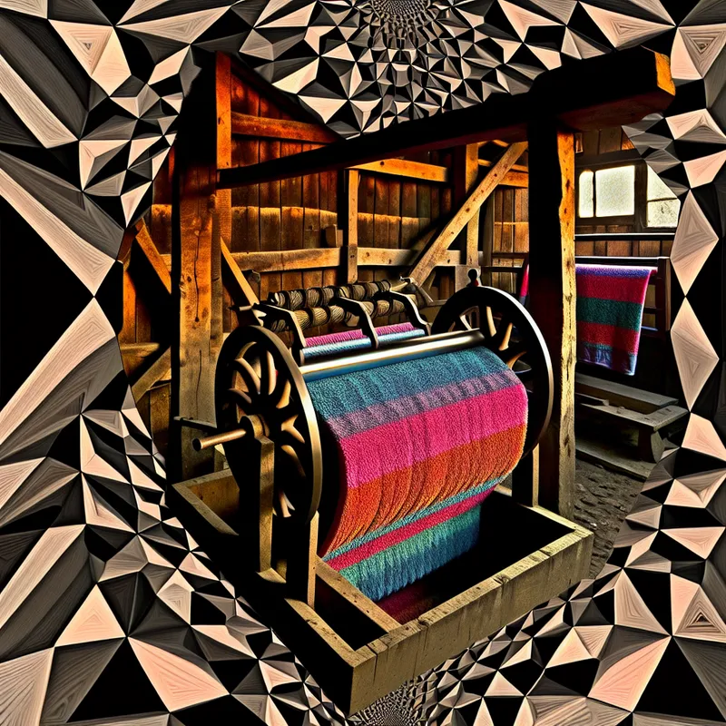 Een oude mangel in een schemerige boerderij met geometrische patronen, waar kleurrijke handdoeken worden geperst tussen grote rollen.