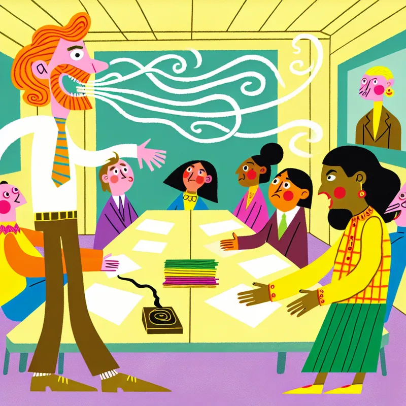 Een minimalistische tekening in de stijl van Dick Bruna van een vergadering met een man die energiek mansplaint.