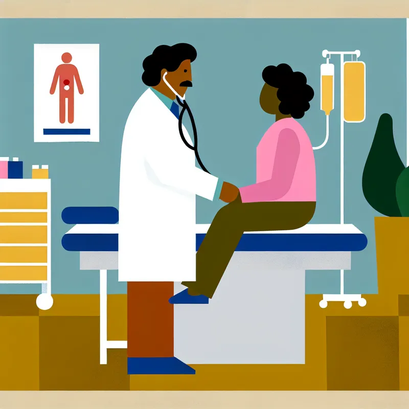 Illustratie van een arts in een medische centrum, die een patiënt onderzoekt op een onderzoekstafel.