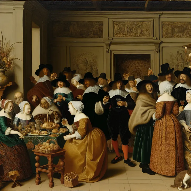 Een elegante feestscène met gasten die gezellig mingelen, gekleed in 17e-eeuwse stijlen en genietend van een atmosfeer vol luxe.