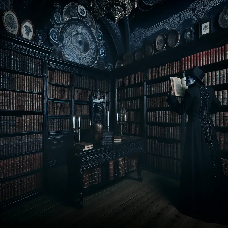 Donkere, mysterieuze bibliotheek met hoge boekenplanken vol oude leren boeken; een schimmige figuur in gotische kleding bekijkt de boeken.