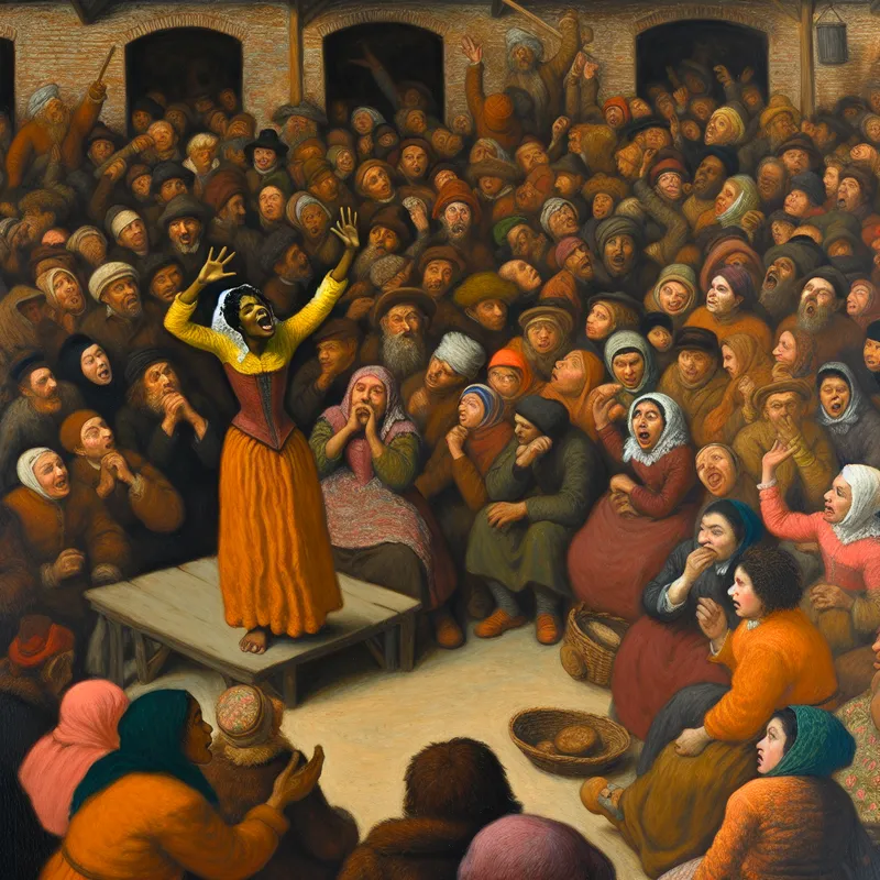 Een persoon op een platform in een drukke openbare ruimte roept naar de verbaasde menigte.