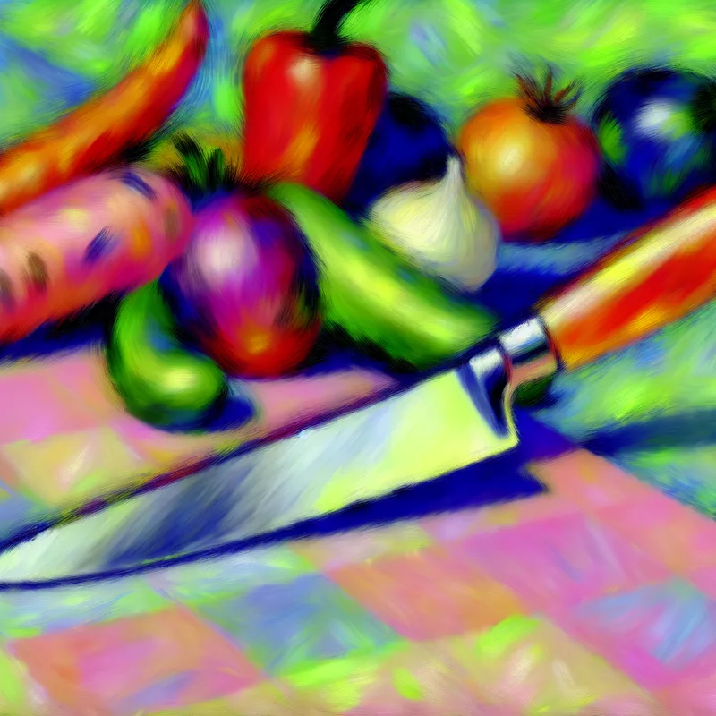 Een scherp keukenmes omringd door kleurrijke, oversized groenten zoals wortelen, paprika's en uien in een abstracte stijl.