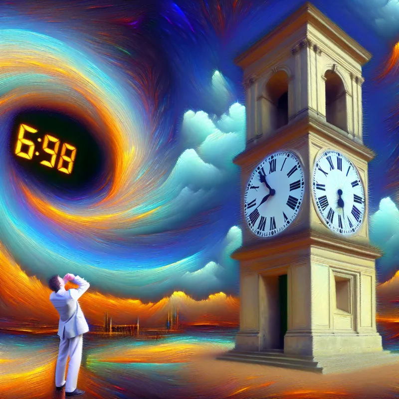 Een hyper-realistische kloktoren met digitale cijfers die aftellen van zestig naar nul, terwijl een persoon in de voorgrond nerveus naar zijn horloge kijkt.