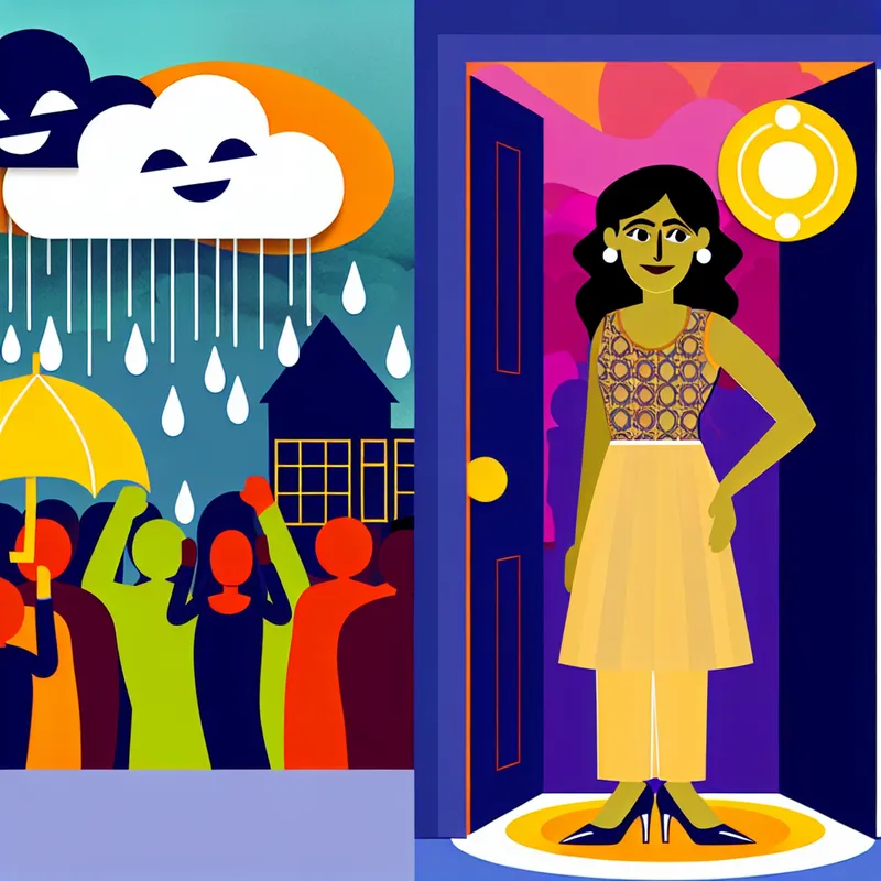 Een vrolijke maar voorzichtige figuur staat bij een deur en overweegt naar buiten te stappen naar een feestelijke scène, met regenachtige wolken boven de deur.