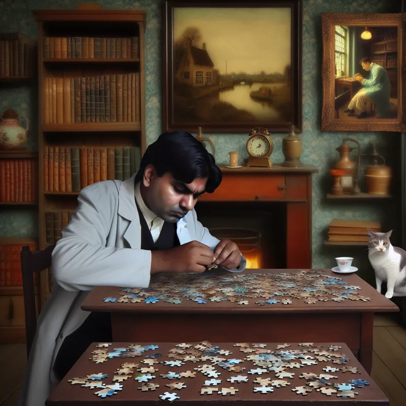 Een persoon worstelt met een complex puzzel in een nostalgische, vintage kamer met boekenkasten en een kat bij de open haard