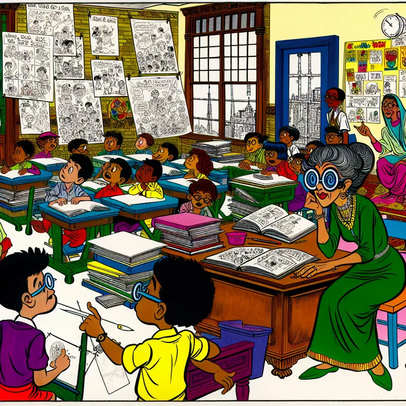 Een cartoonachtig klaslokaal met een leraar die studenten observeert tijdens een les.