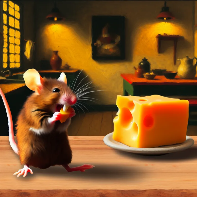 Een levendige bruine muis die op een houten keukentafel een stuk kaas aan het knabbelen is.