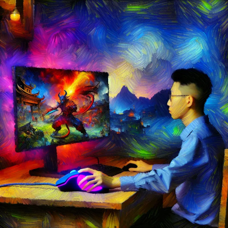 Persoon achter een bureau met een kleurrijke muis, volledig gefocust op een intensieve gamesessie, omgeven door een levendig, impressionistisch gekleurde kamer