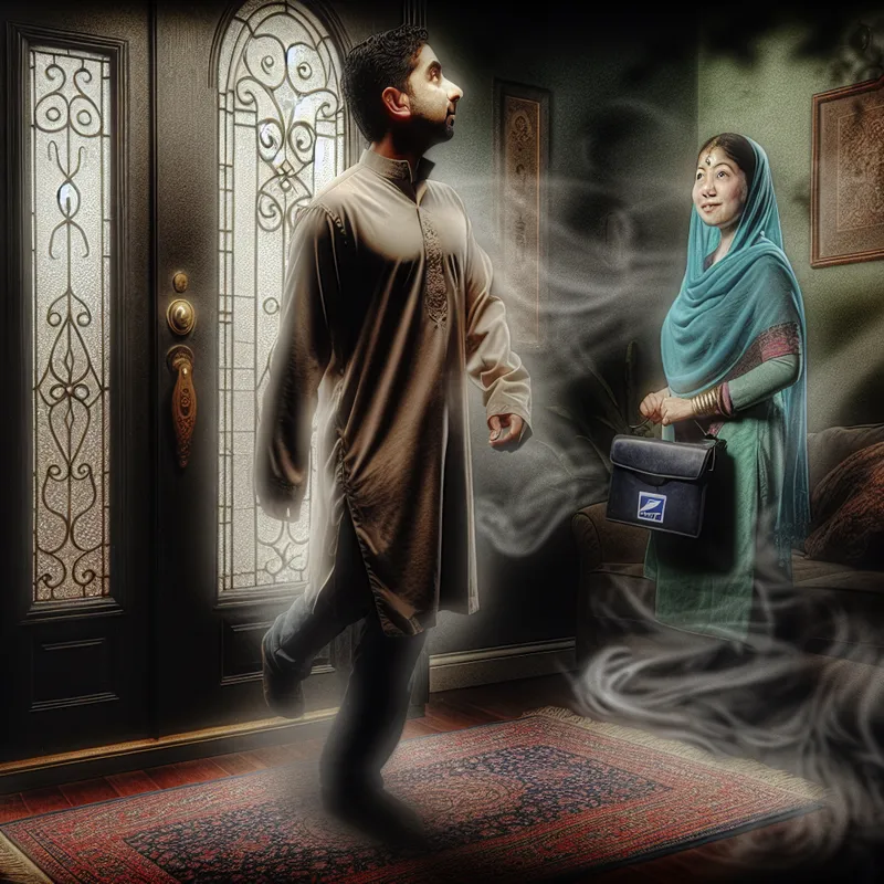 Een man loopt naar een voordeur waar een postbode staat. Donkere, gotische stijl vergelijkbaar met Félicien Rops.