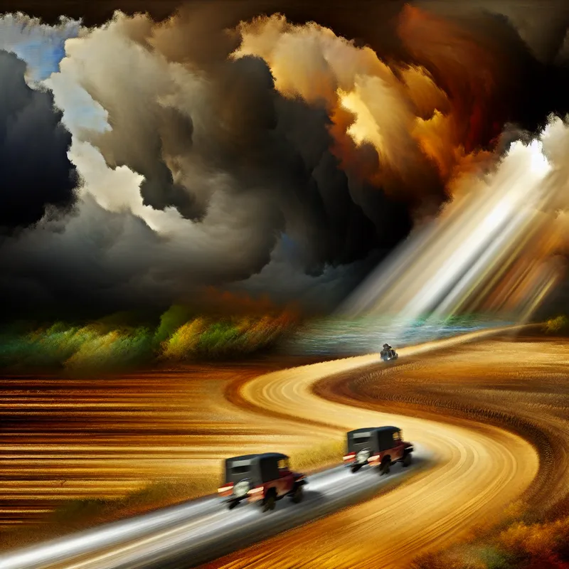 Twee auto's naderen elkaar op een kronkelige weg onder een dreigende stormlucht