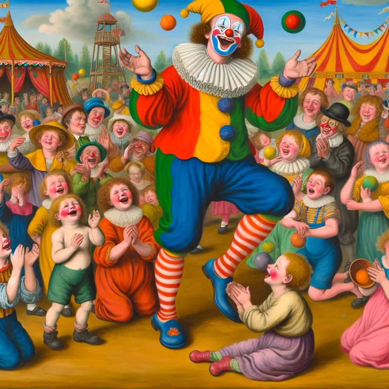 Levendige clown die kleurrijke ballen jongleert voor lachende kinderen in een circusomgeving.