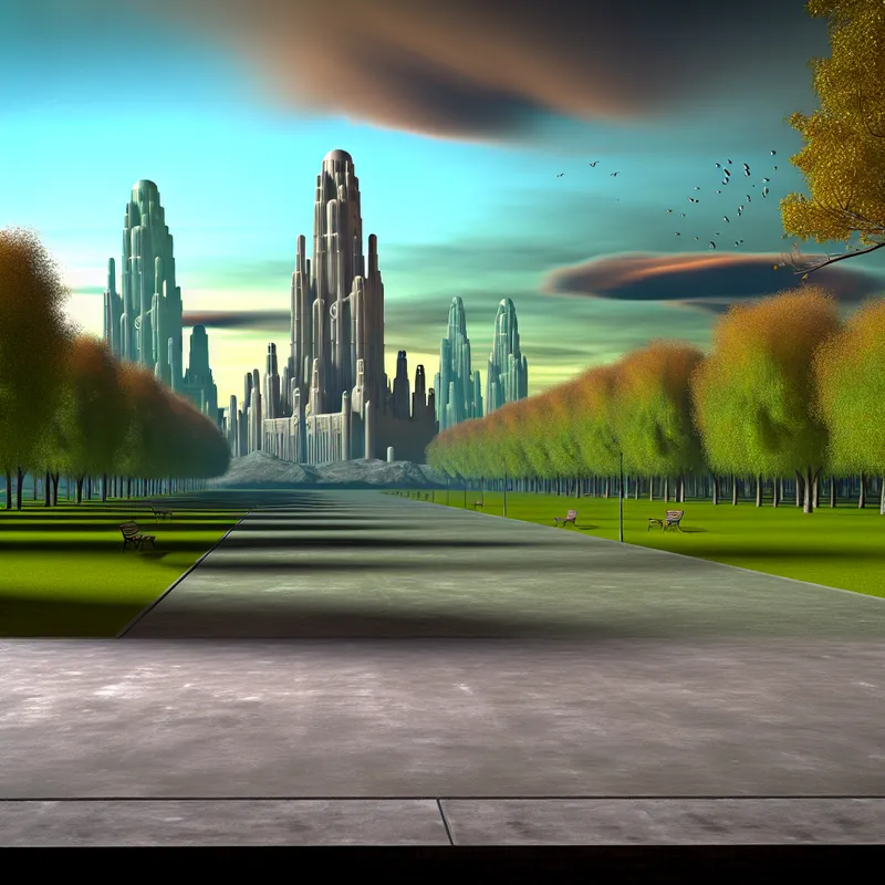 Een surrealistisch park met indrukwekkende, monumentale structuren op de achtergrond en geen mensen zichtbaar in de weidse ruimte.