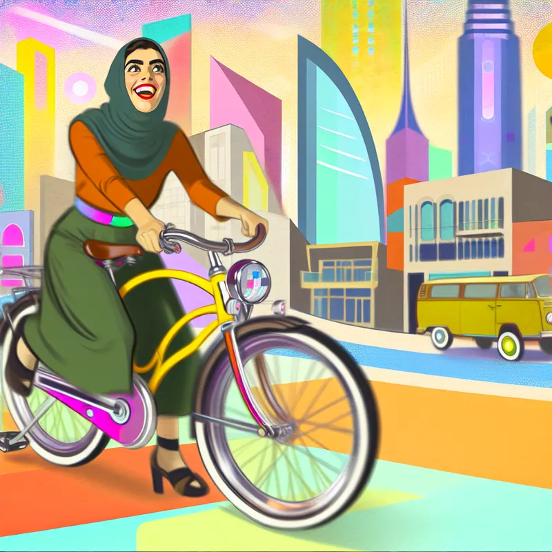 Een jonge vrouw die blij een nieuwe fiets rijdt door een kleurrijke stad met moderne architectuur.