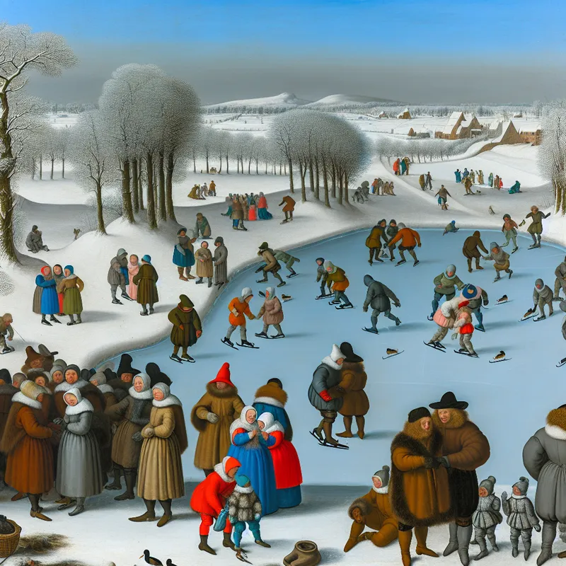Een winterse scène met een bevroren vijver waar mensen wachten en kinderen schaatsen
