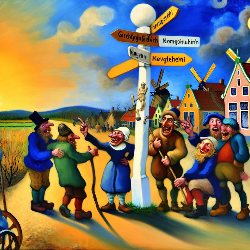 Gezellig dorp in het noorden van Nederland met bewoners die plannen bespreken en een aanwijzingsbord naar het noorden.