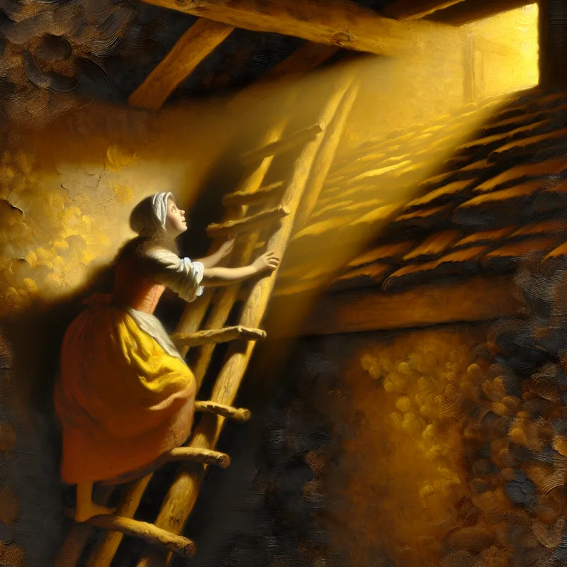 Ze klom omhoog langs de ladder naar de zolder.