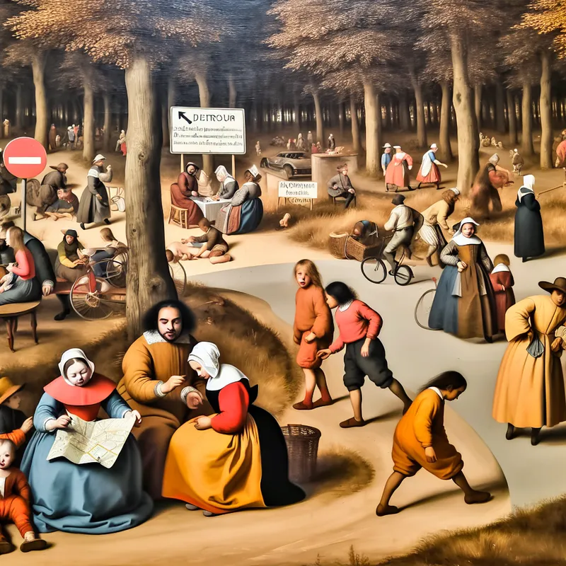 Drukke park scene met een familie die speelt en een stel dat een kaart bekijkt, omringd door bomen en bankjes.