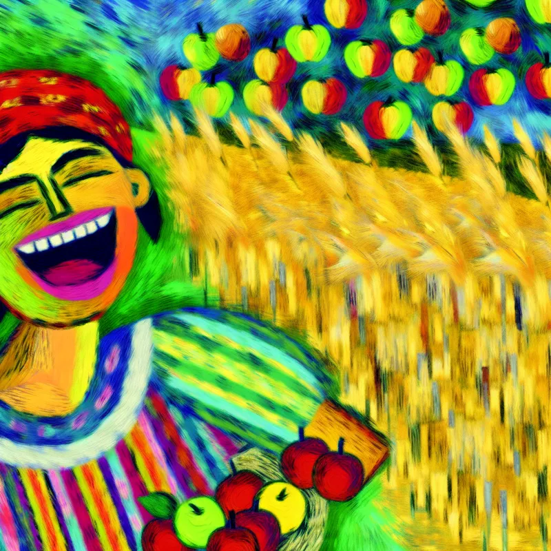 Een vrolijke boer die geniet van het oogsten van rijpe appels in een kleurrijke, abstracte omgeving