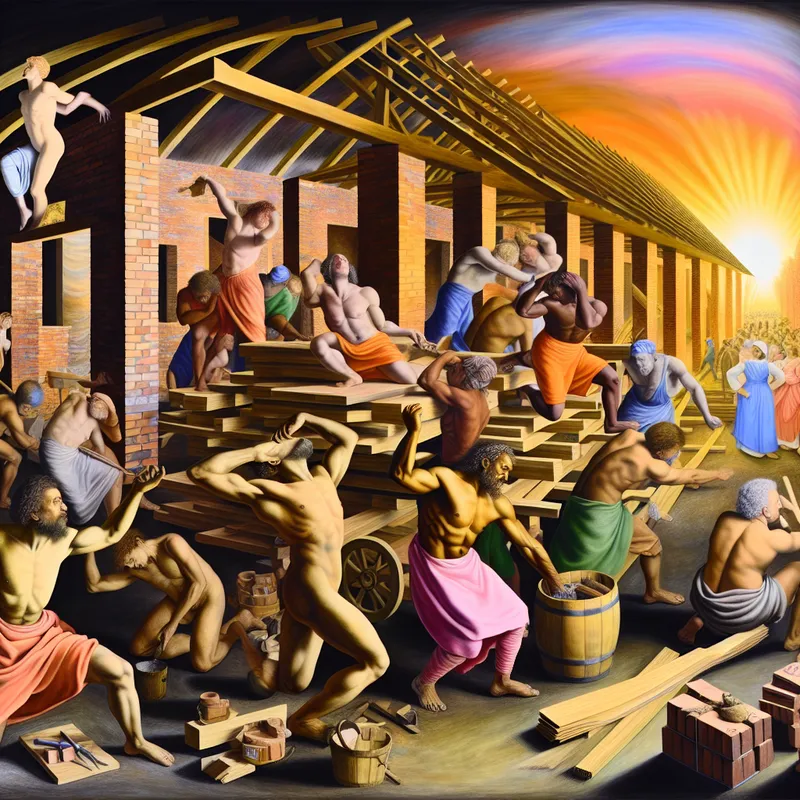 Constructiescene met arbeiders die aan een nieuw huis bouwen, omringd door bouwmaterialen, verlicht door een kleurrijke zonsondergang