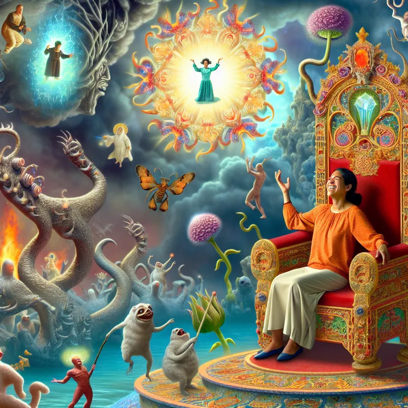 Vrouw op een grote, versierde troon met een opgeluchte uitdrukking, omringd door bizarere wezens en een zwaar wolkendek dat haar zorgen symboliseert.