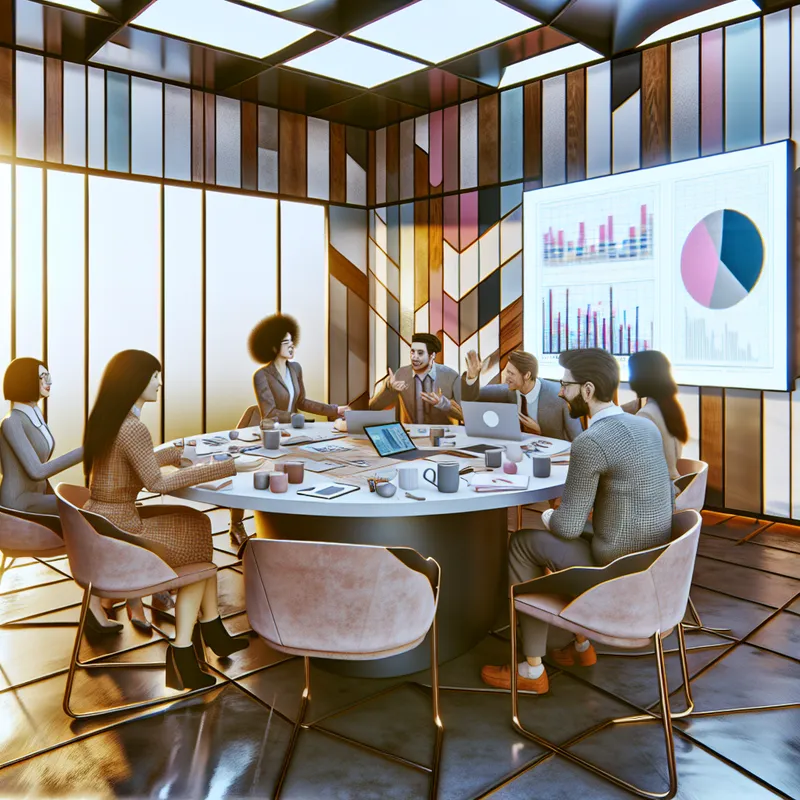 Collega's in een moderne vergaderruimte tijdens een levendige bespreking rond een ronde tafel, met grafieken op het scherm.