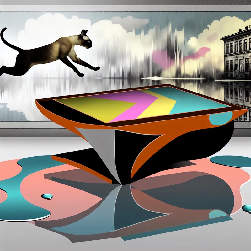 Kat springt boven een retro-futuristische tafel