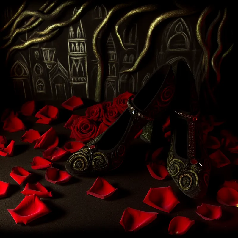 Een paar elegante, intricately ontworpen schoenen op een bed van rozenblaadjes.