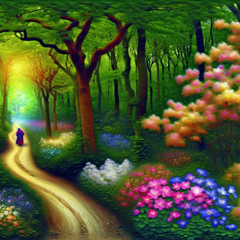 Een persoon wandelt over een smal pad in een weelderig bos, omgeven door bloemen en hoge bomen.