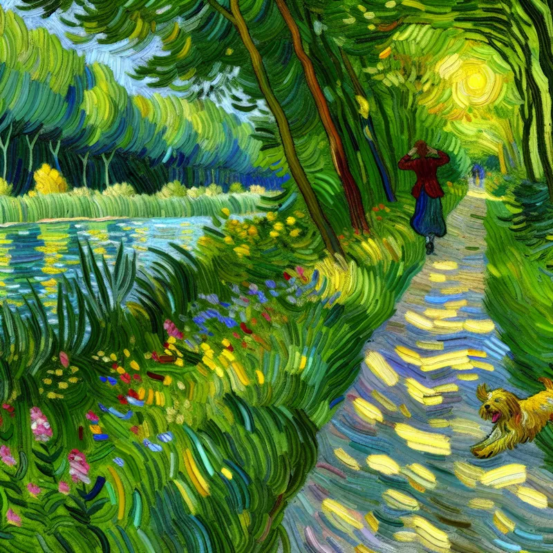 Een smal pad in een bos met een persoon die wandelt en een speelvriendelijke hond die naar een meer rent.