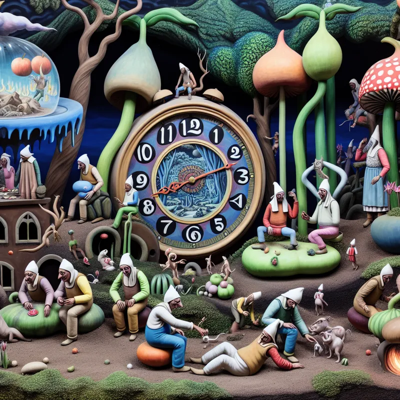 Een surrealistisch tafereel met arbeiders die een pauze nemen in een bizarre landschap, omringd door vreemde wezens en gigantische vruchten.