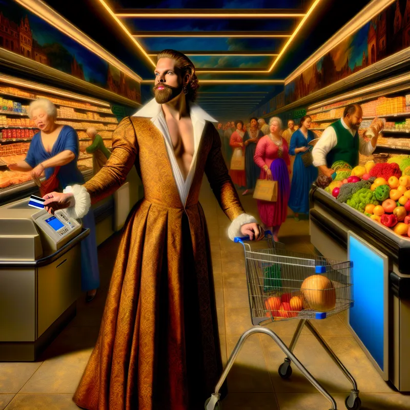 Een zelfverzekerd persoon in een supermarkt met een betaalpas in de hand, omringd door kleurrijke boodschappen.