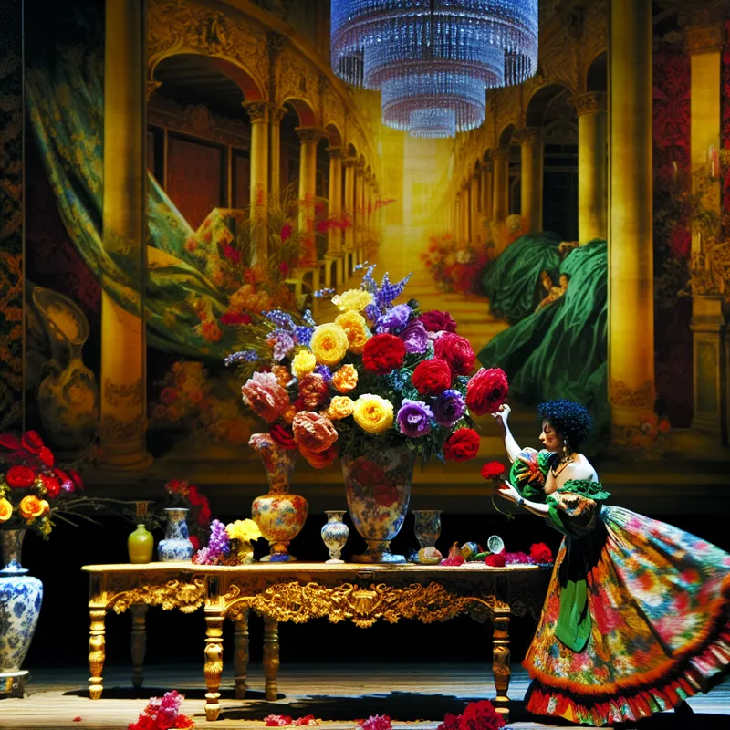 Een vrouw plaatst elegant een groot boeket bloemen op een rijk versierde tafel in een Barokke setting.
