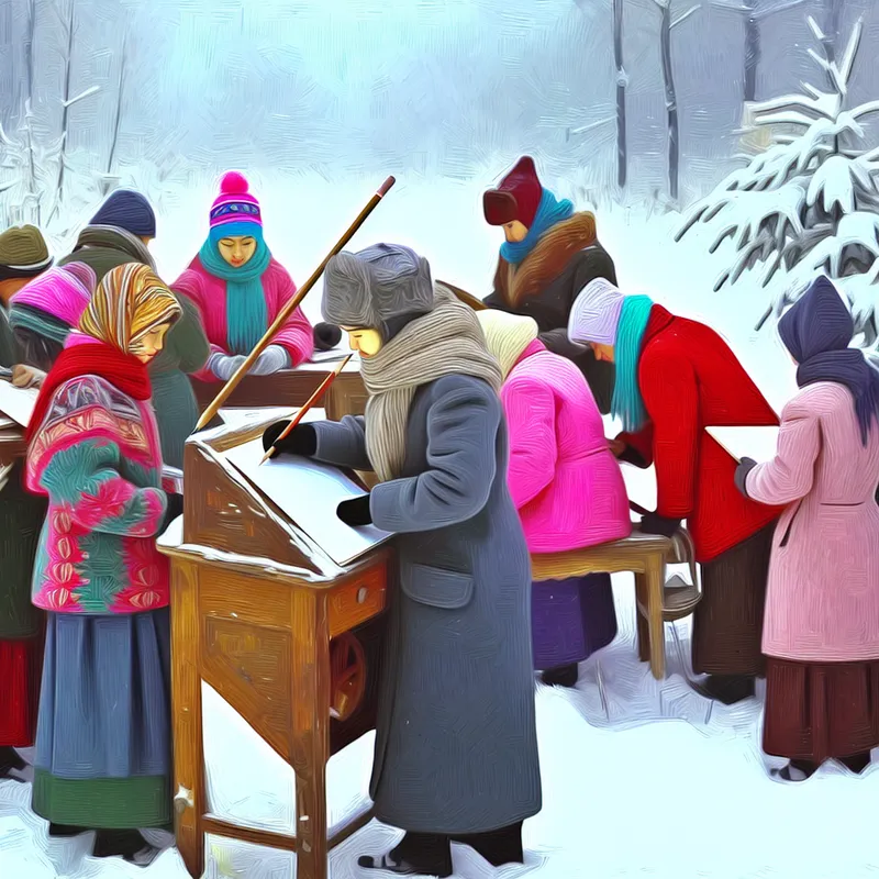 Een groep vrolijke studenten in kleurrijke winterkleding, samengekomen rond een houten bureau buiten, terwijl een student met een houten potlood notities maakt in de sneeuw.