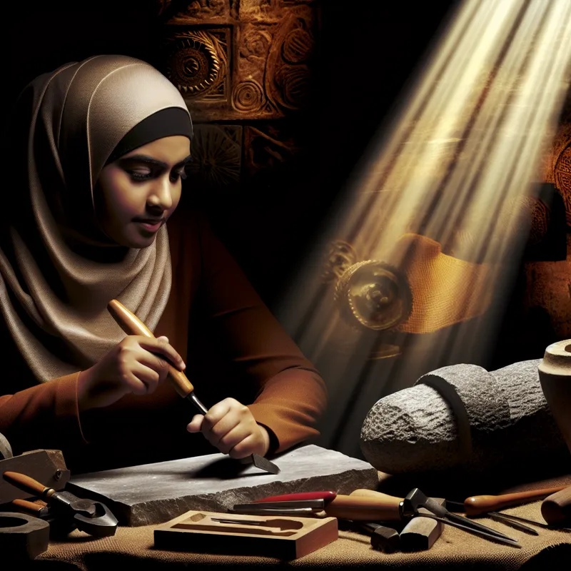 Een jonge vrouw die in een workshop steen bewerkt, met een gefocuste uitdrukking en artistieke gereedschappen om haar heen.