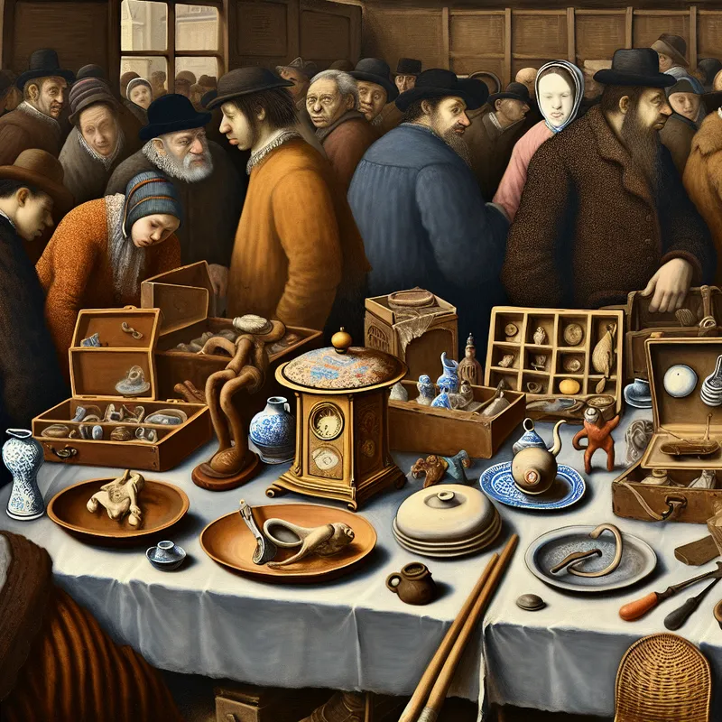 Een rommelmarkttafel vol ongebruikelijke en vreemde voorwerpen zoals een kapotte klok, mismatched servies en vergeelde speelgoedjes, met een gebroken porseleinen beeldje op de voorgrond.