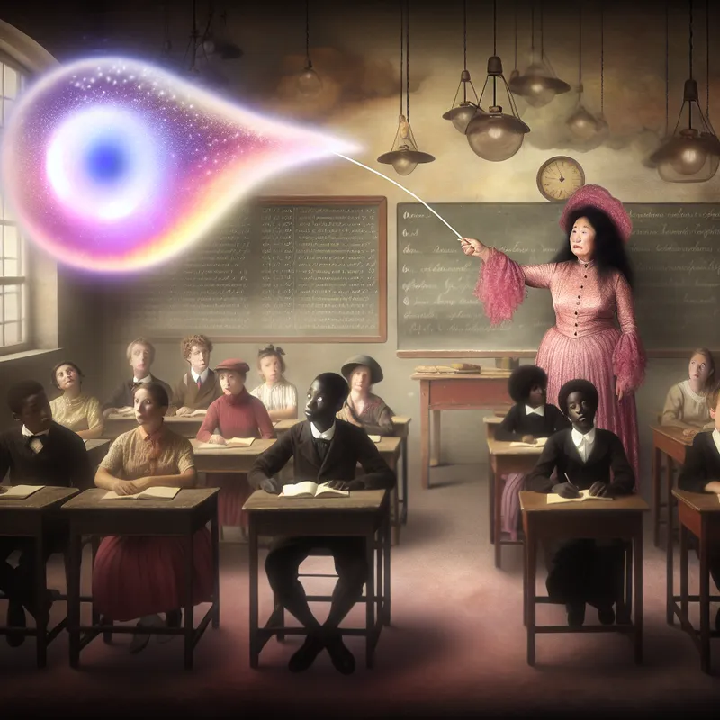 Een kleurrijke afbeelding van een vintage klaslokaal waar een leraar aanwijst op het bord en een grote stip in de lucht zweeft, wat een punt symboliseert.